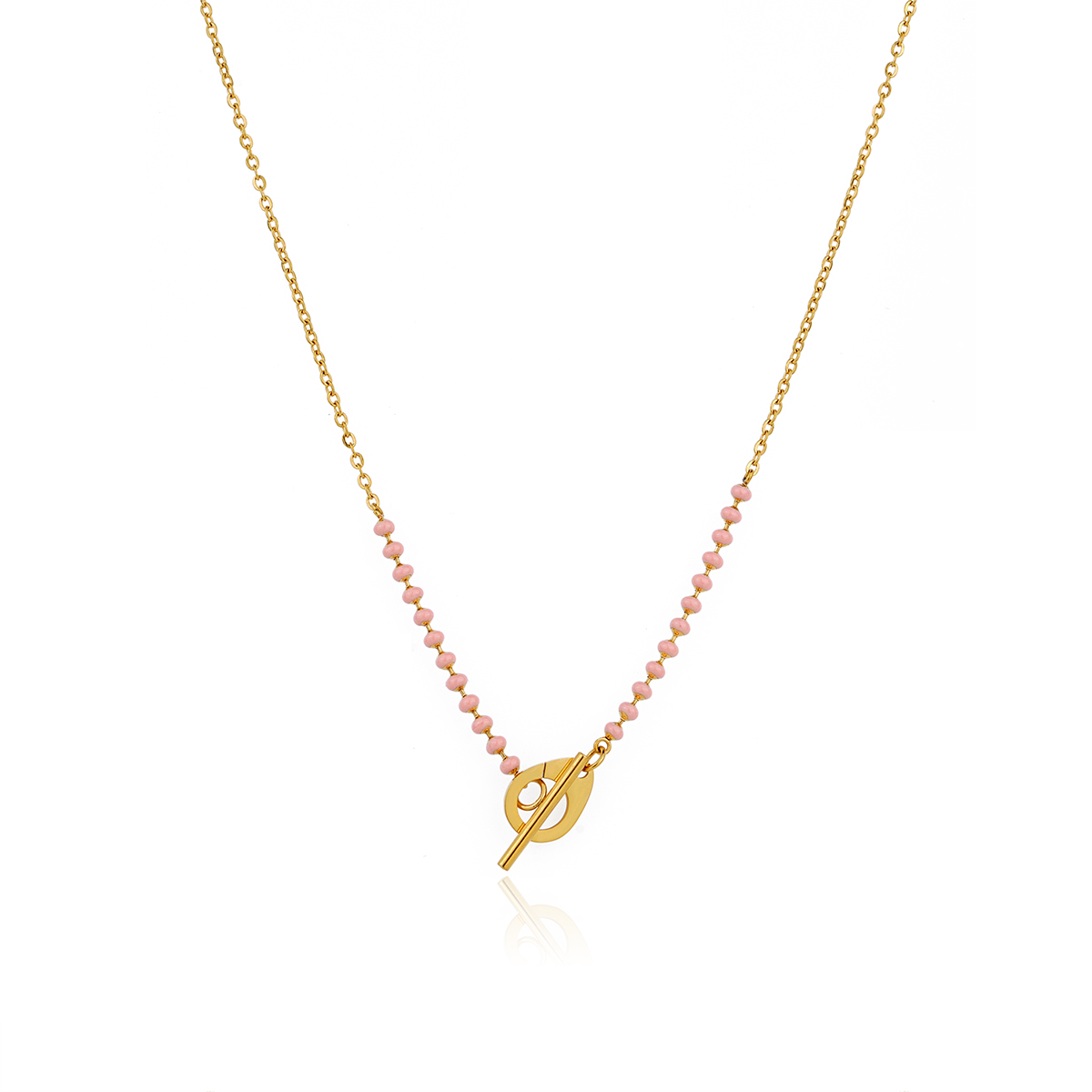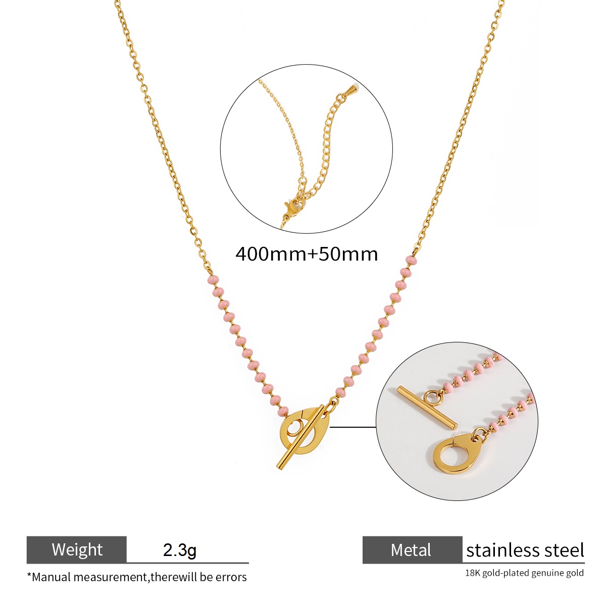 This 18K gold necklace combines timeless elegance with a playful twist of modern design. Meticulously crafted from gold plated stainless steel, it exudes a subtle luxury that complements both casual and refined looks. Accented with colorful enamel beads and a unique OT buckle necklace clasp inspired by a handcuff silhouette, this piece redefines contemporary minimalism with a hint of bold personality.