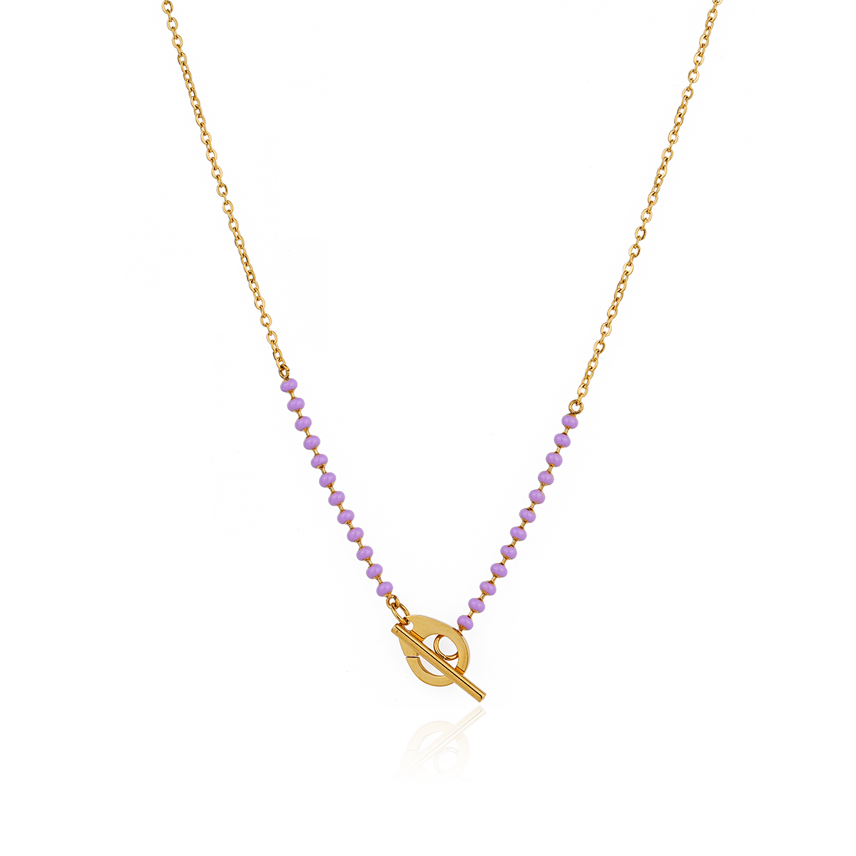 Along the front section of the necklace, glossy enamel-coated beads add a lively touch of color. Available in black, purple, pink, and green, each shade reflects a distinct mood — classic, feminine, or vibrant. The beads are precisely spaced and polished, giving this colorful bead necklace a refined yet youthful charm. Whether styled solo or paired with other pieces, it becomes a chic statement for modern women seeking a beaded gold necklace that feels elegant and spirited.