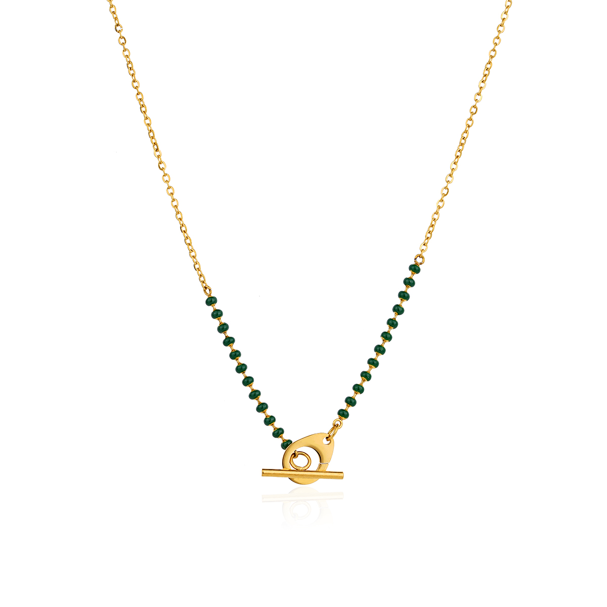 The highlight of this beaded toggle necklace lies in its distinctive OT clasp — one side features a sleek circular ring, while the other takes the form of a minimal handcuff-inspired bar closure. This clever structure not only secures the chain with ease but also doubles as a decorative centerpiece. The handcuff toggle clasp blends modern geometry with subtle symbolism, suggesting both strength and connection — a perfect detail for those who appreciate meaningful design.