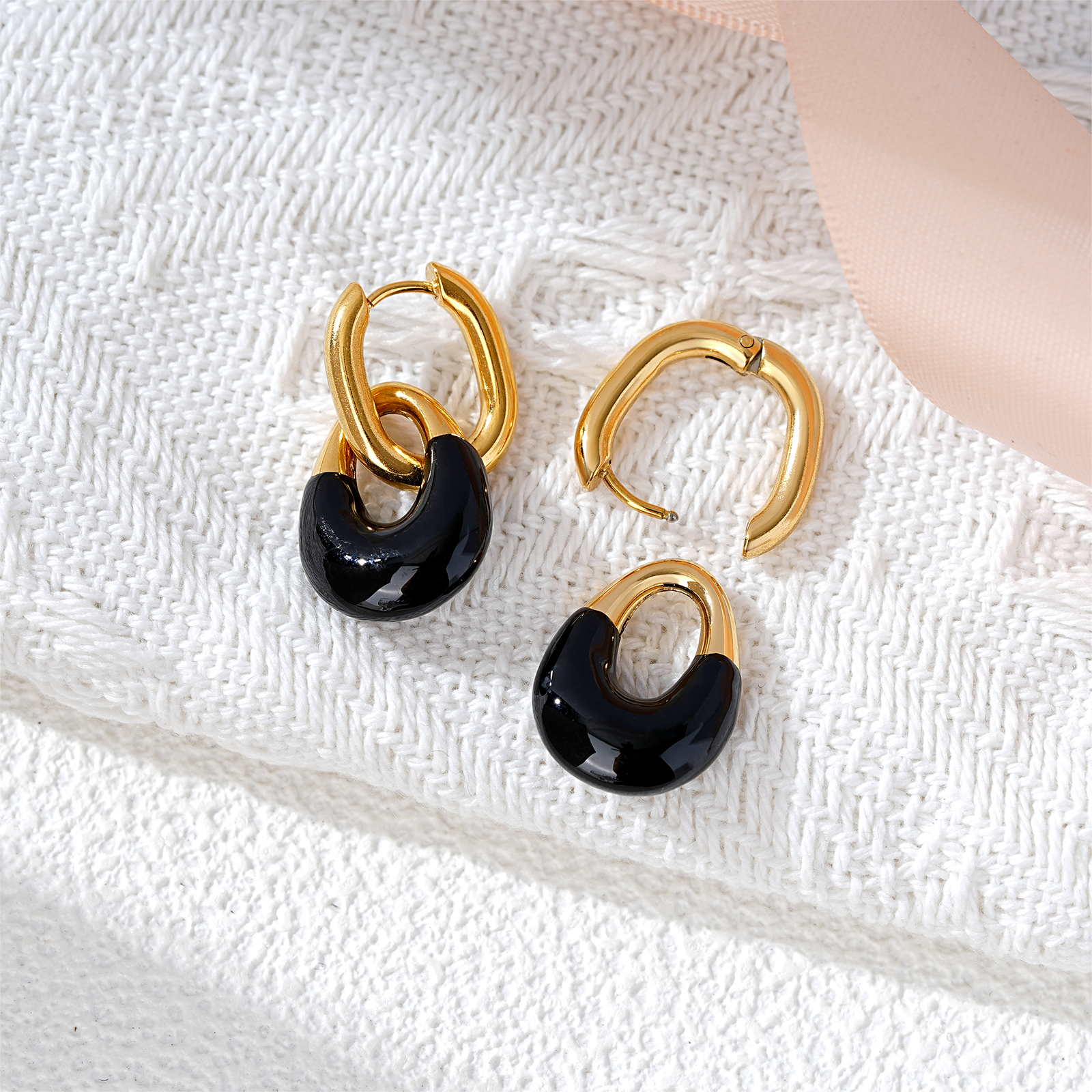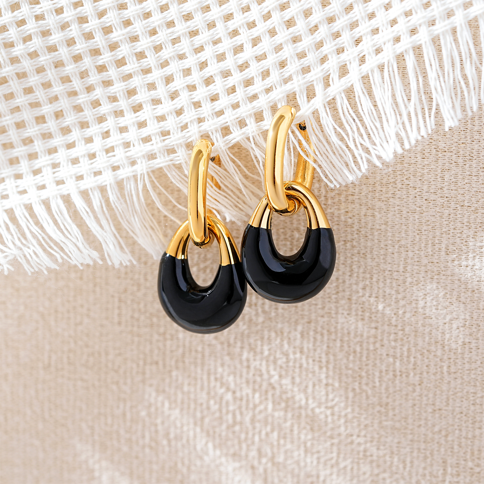 The lower section features a smooth black enamel earrings finish (epoxy coating), creating a striking contrast against the polished gold tone.