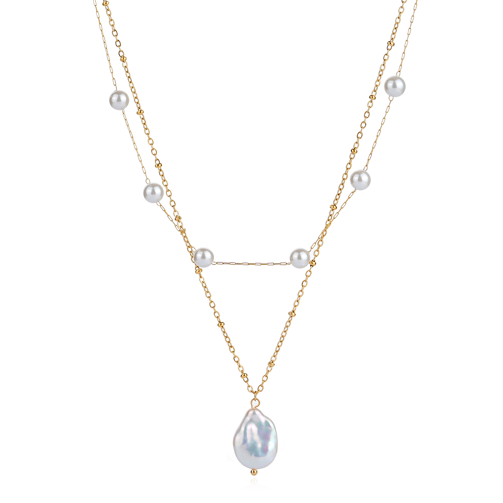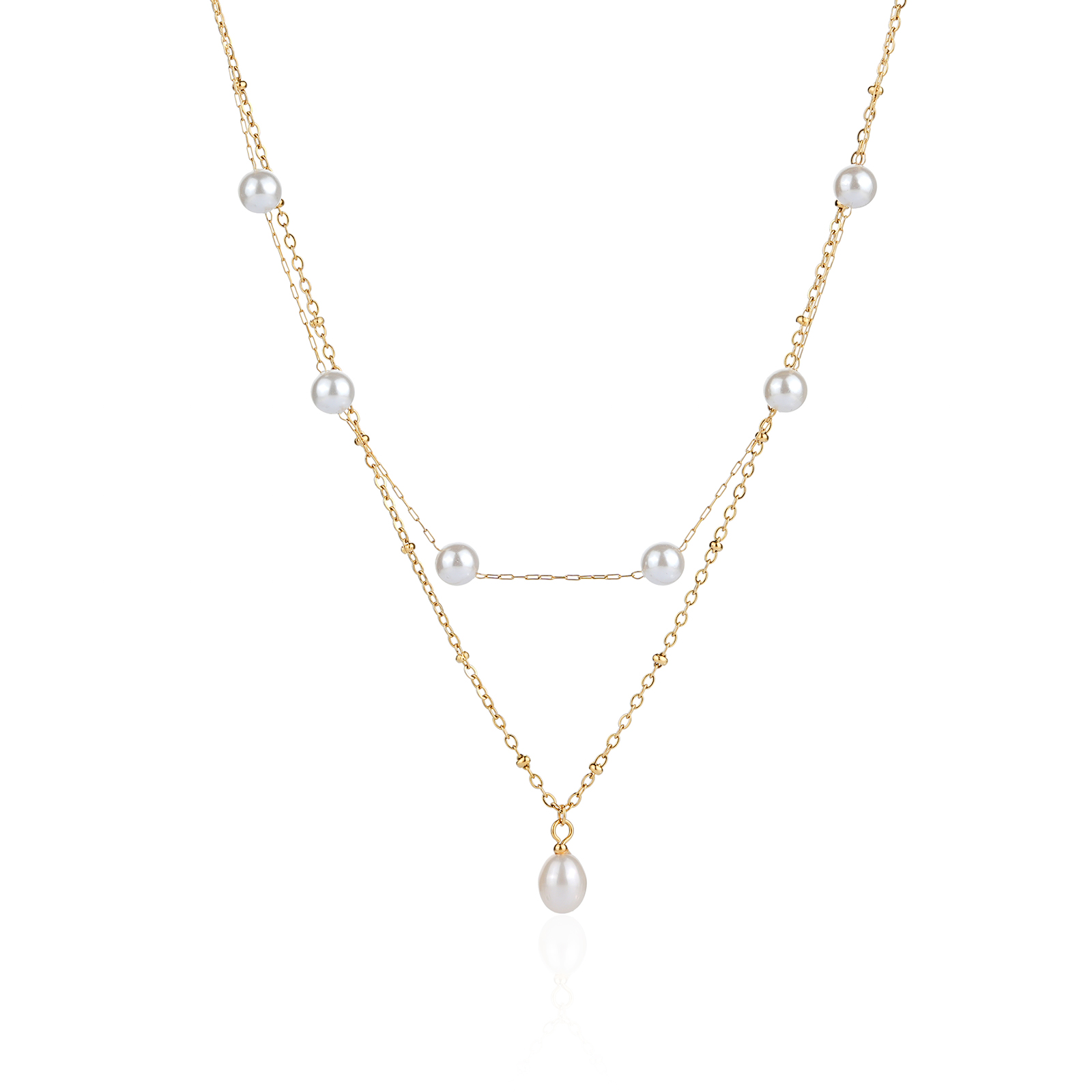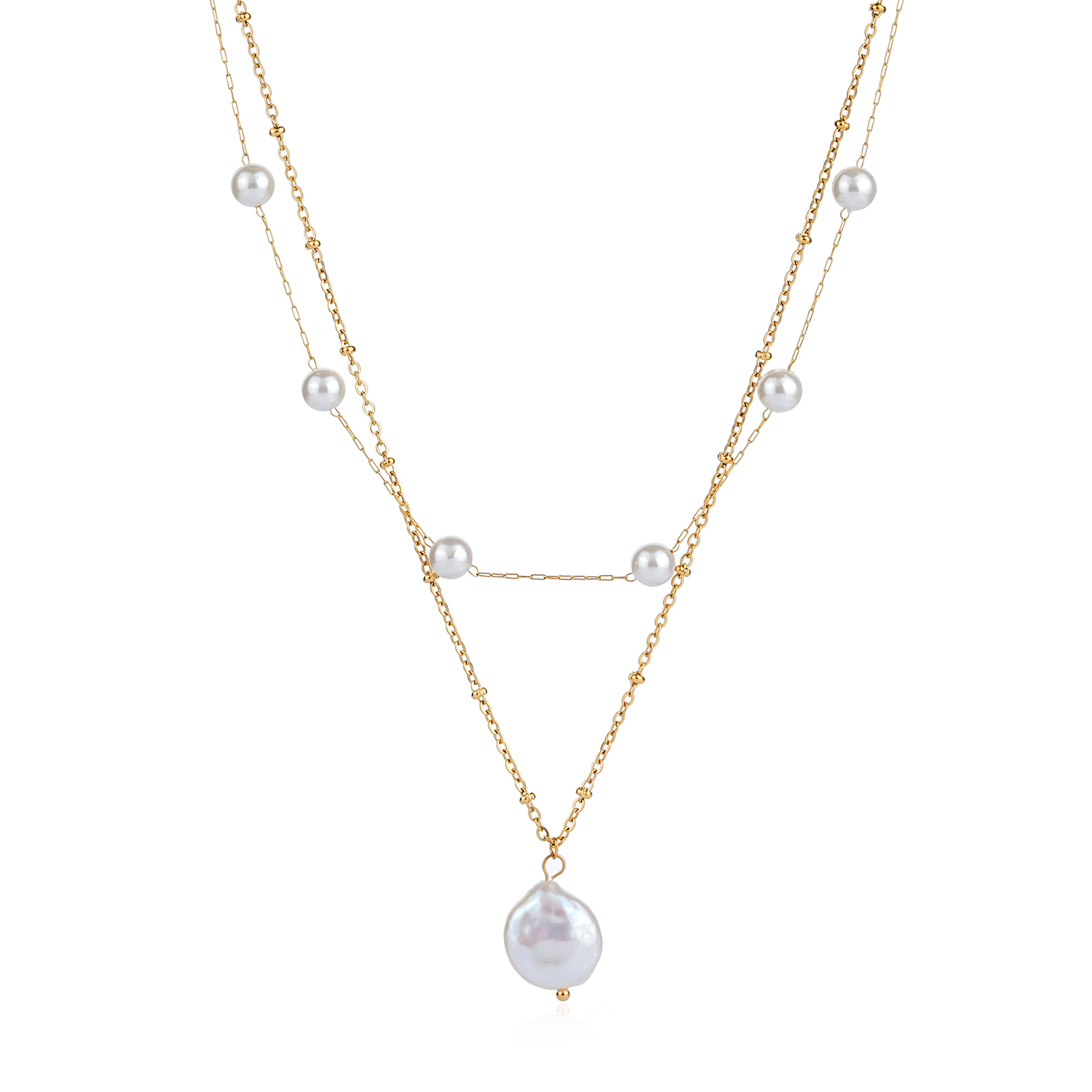 • The upper layer is adorned with evenly spaced shell pearls, creating a clean rhythm and gentle luster that defines the look of a simple pearl necklace.