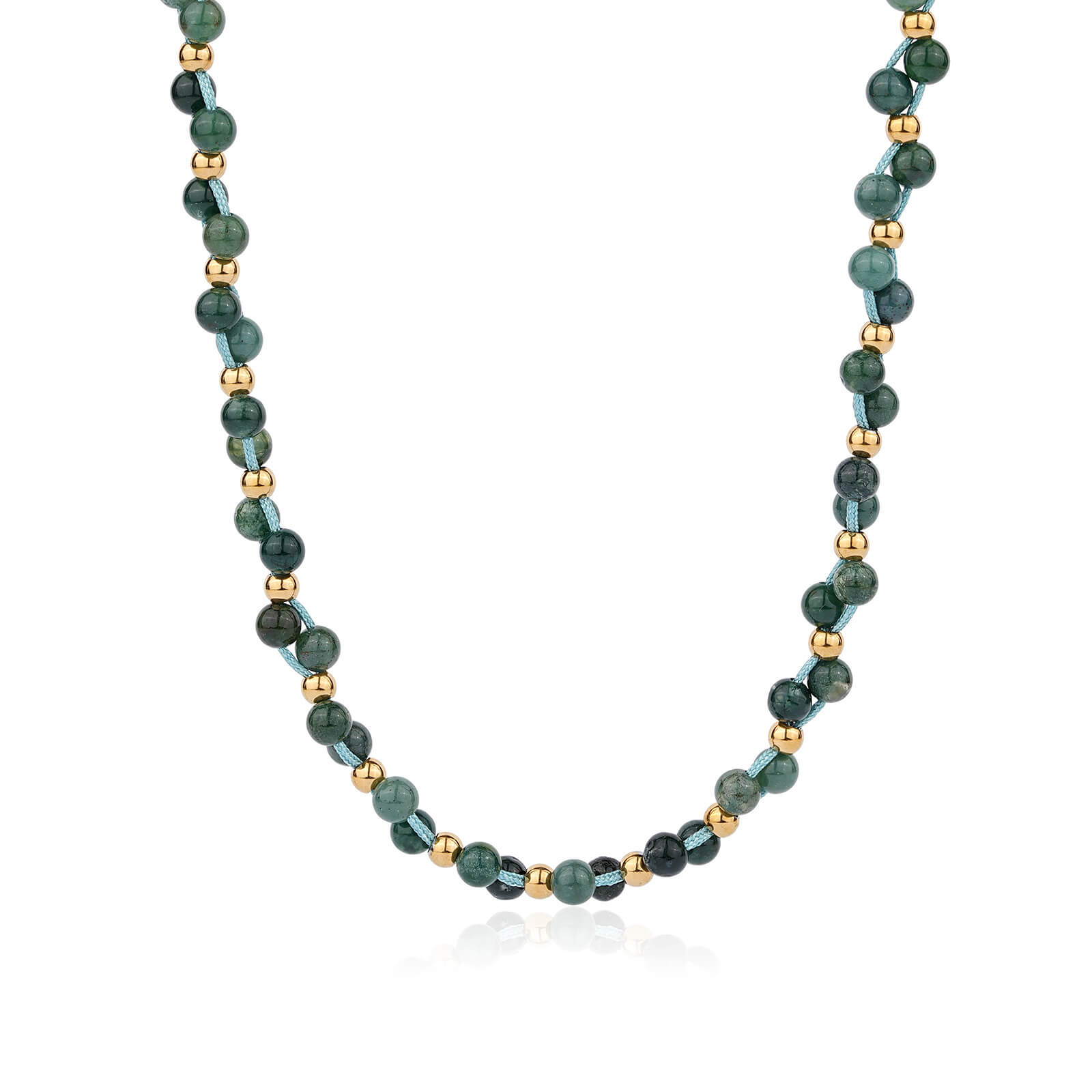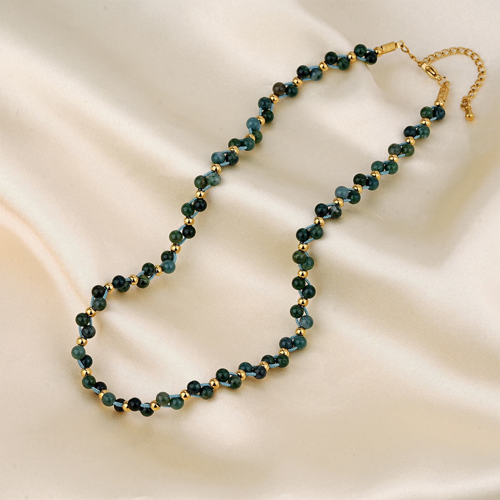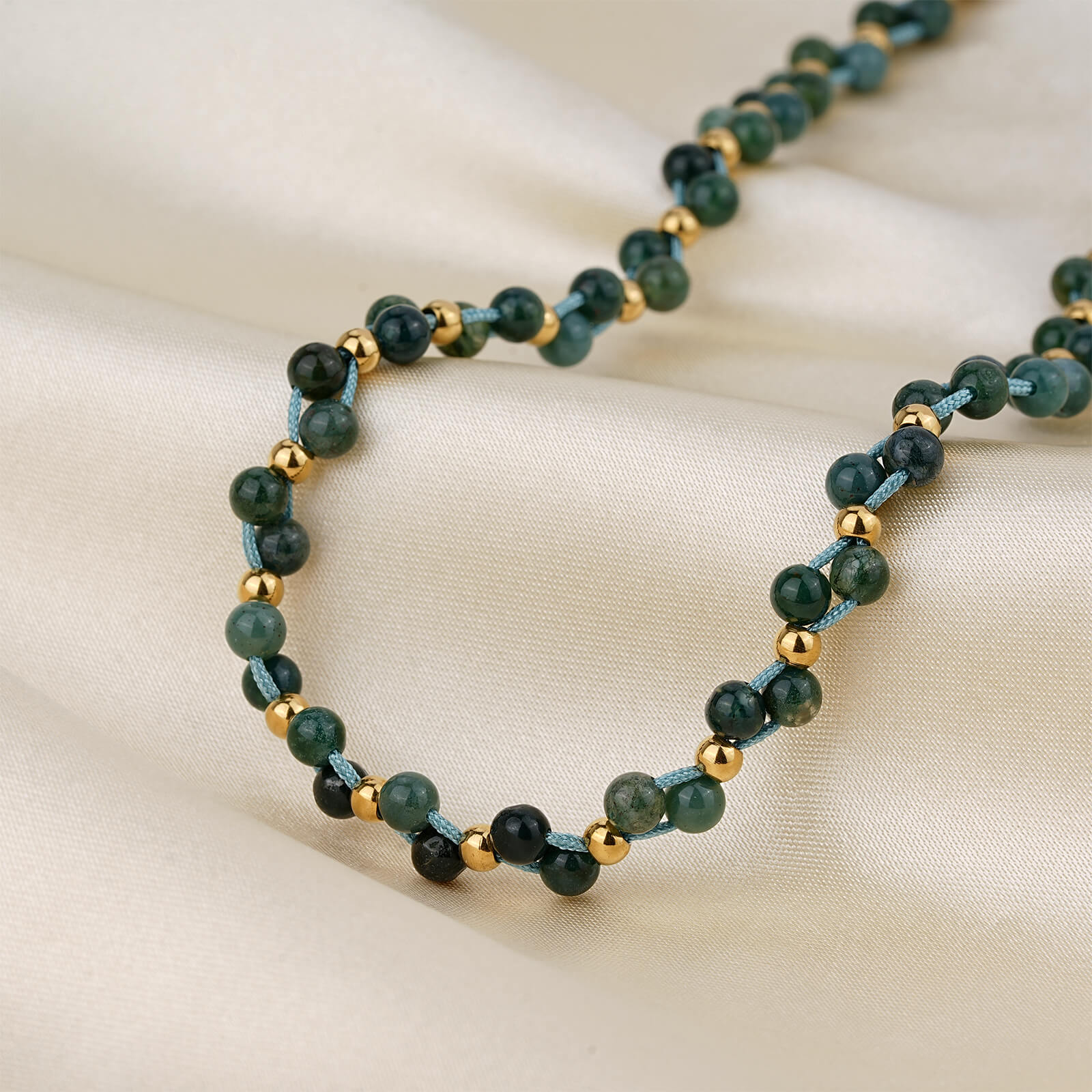 Embrace the calm beauty of nature with this green moss agate necklace, a piece that captures the quiet elegance of the forest within each bead. Handcrafted with precision and care, this moss agate beaded necklace brings together natural gemstones and golden accents for a timeless, earthy aesthetic.