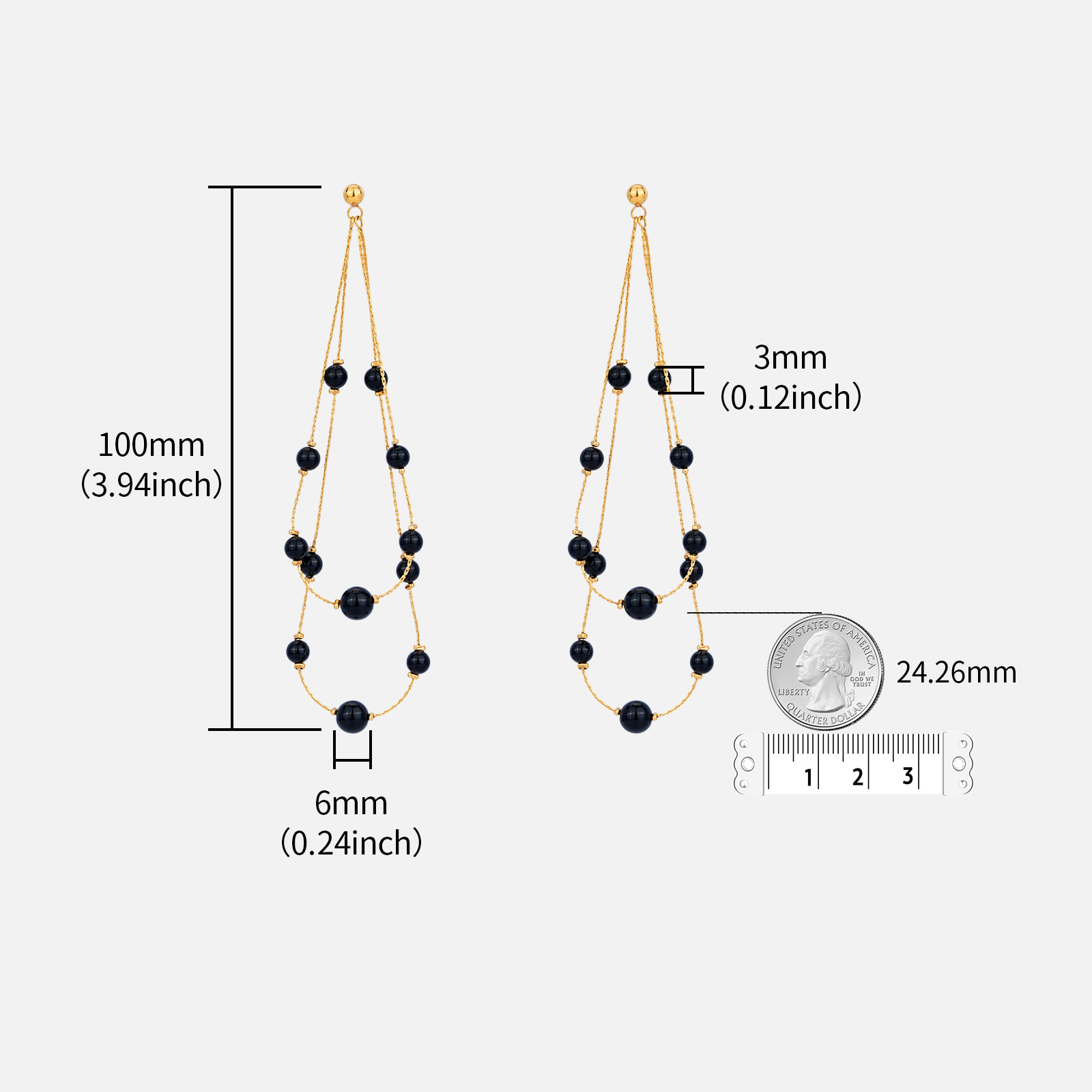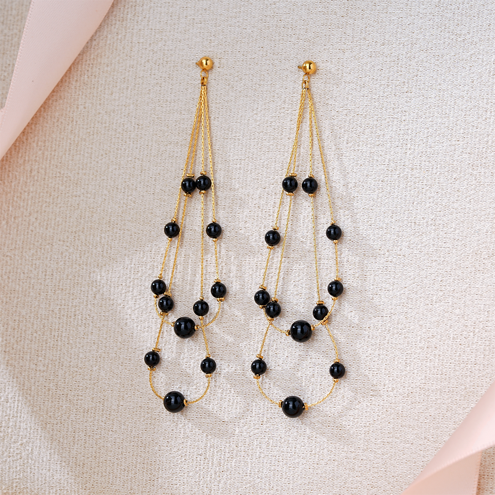 These earrings are crafted from high-quality stainless steel earrings base, finished with a durable 18k gold plated earrings coating. The surface has a smooth, refined shine that resists dullness while maintaining a lightweight feel. Combined with polished black onyx beads, the design achieves a strong contrast between deep natural stone texture and metallic brilliance. This makes them ideal as gold chain black onyx earrings that elevate both casual and formal outfits.