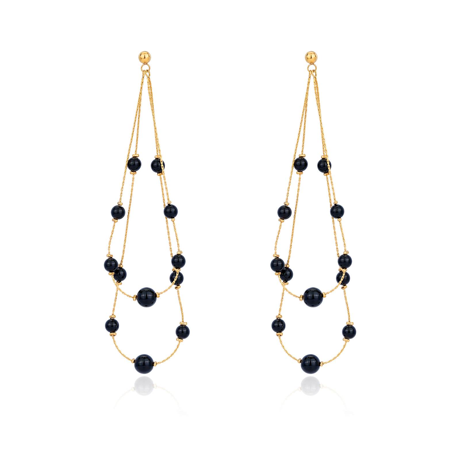 Multiple black onyx spheres are carefully positioned along the chains, creating a rhythmic spacing that defines the overall geometry. Each bead is flanked by small cylindrical spacers, adding structure and refinement. This makes the design not only visually balanced but also highly recognizable as onyx bead earrings and black onyx layered chain earrings. The contrast between gold and black enhances depth and sophistication.