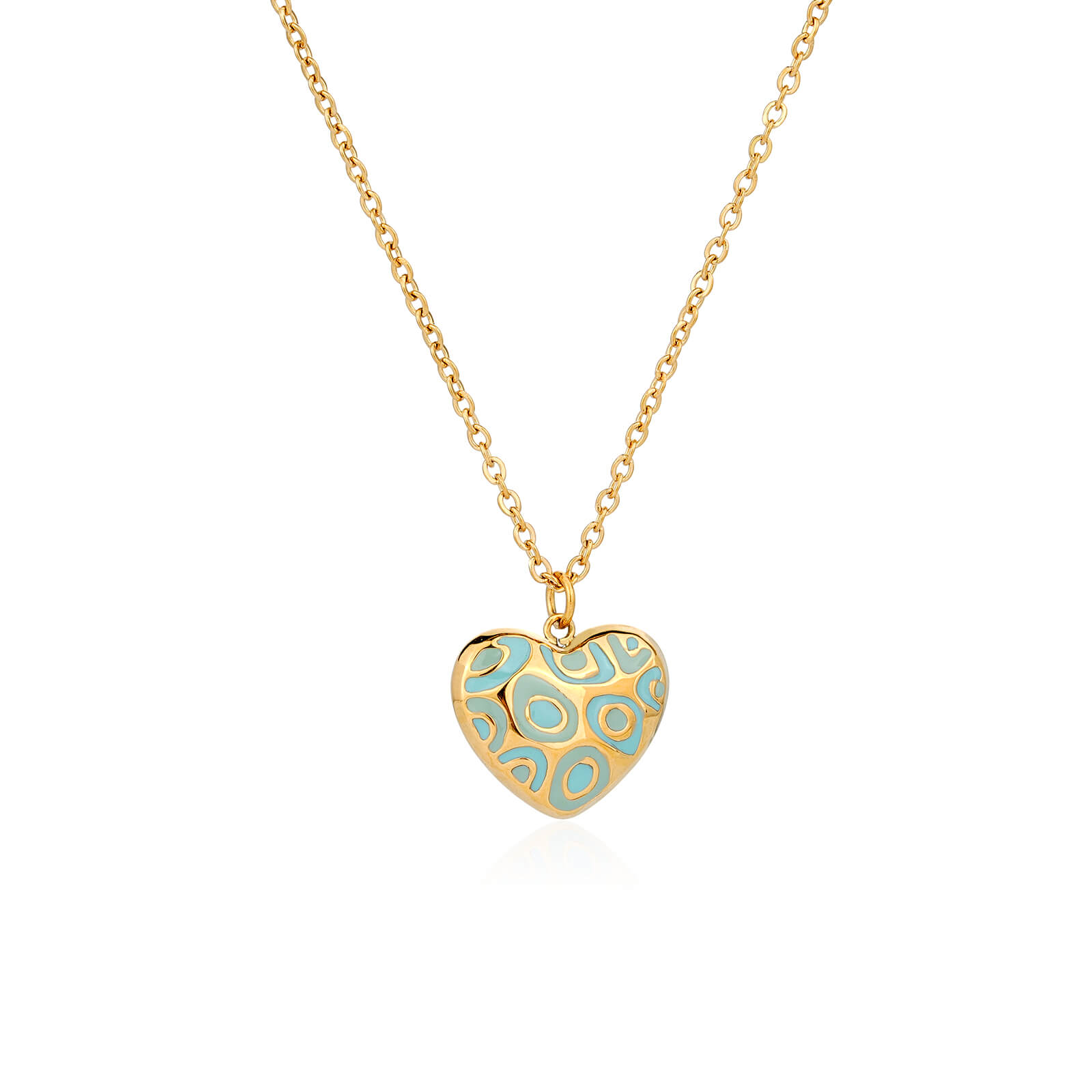 With its vivid enamel surface and gold outline, this piece works as a statement heart necklace while remaining lightweight and comfortable. The design is expressive but not overpowering, making it suitable for solo wear or layering with simpler chains. As a colorful heart necklace, it instantly draws attention in display settings.