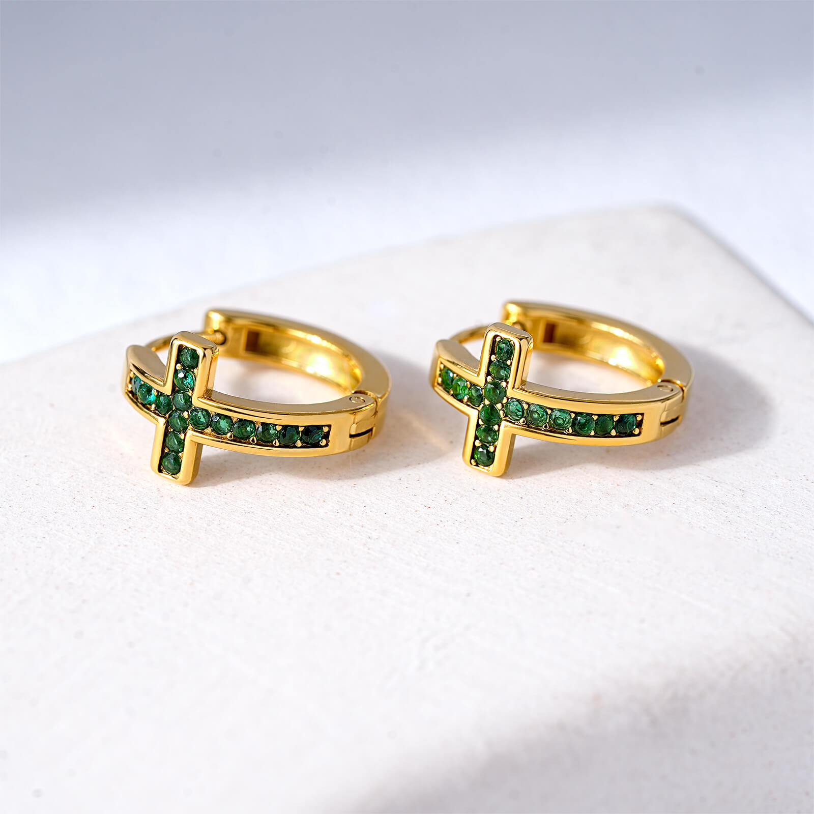 The perfect balance between symbolism and modern elegance defines these beautifully crafted gold cross hoop earrings. Inspired by the timeless cross motif, this design blends classic religious symbolism with contemporary jewelry aesthetics. The warm gold tone combined with sparkling green stones creates a refined yet distinctive look, allowing the earrings to stand out while remaining elegant and wearable. Designed for everyday fashion as well as meaningful styling, these earrings represent a sophisticated interpretation of modern cross huggie earrings.