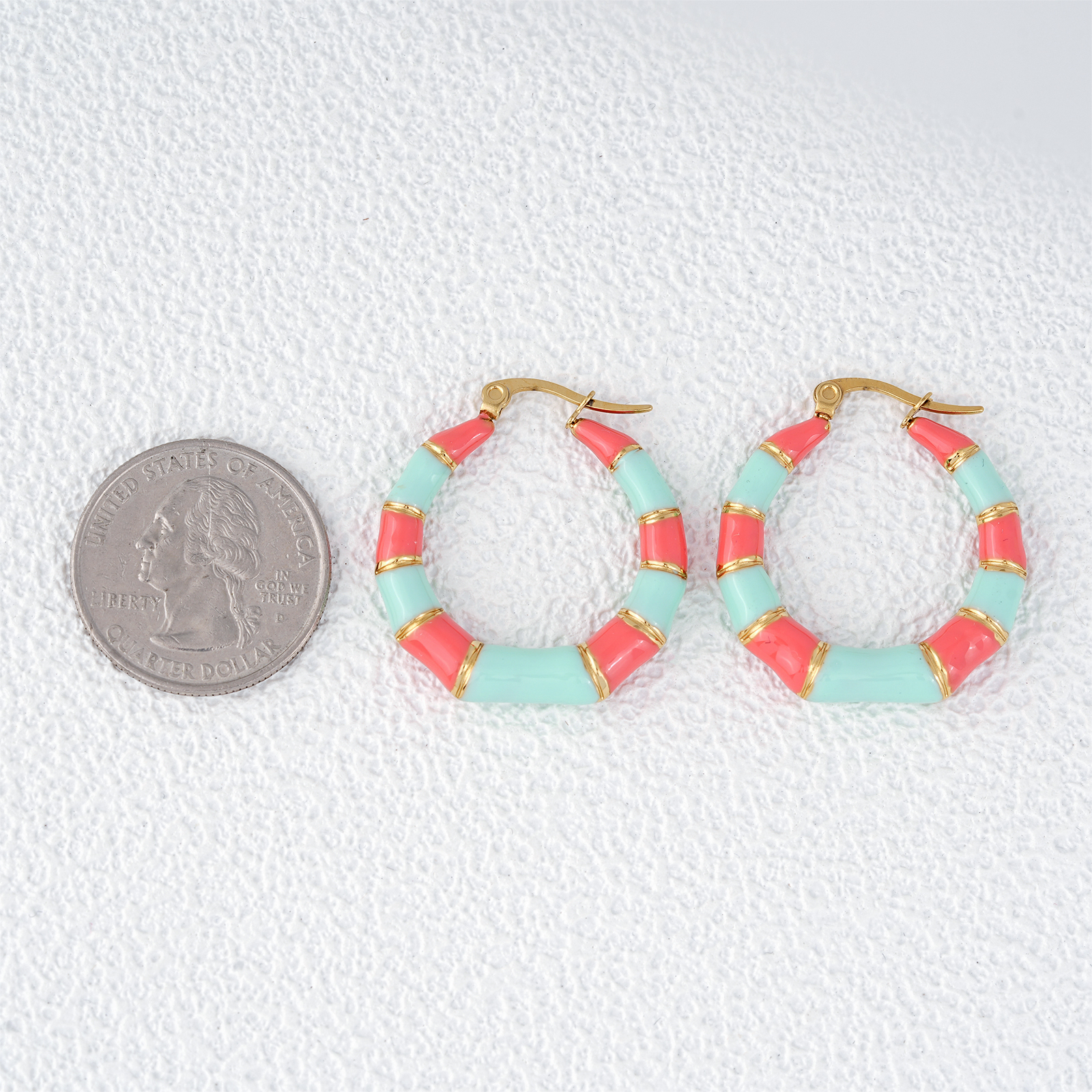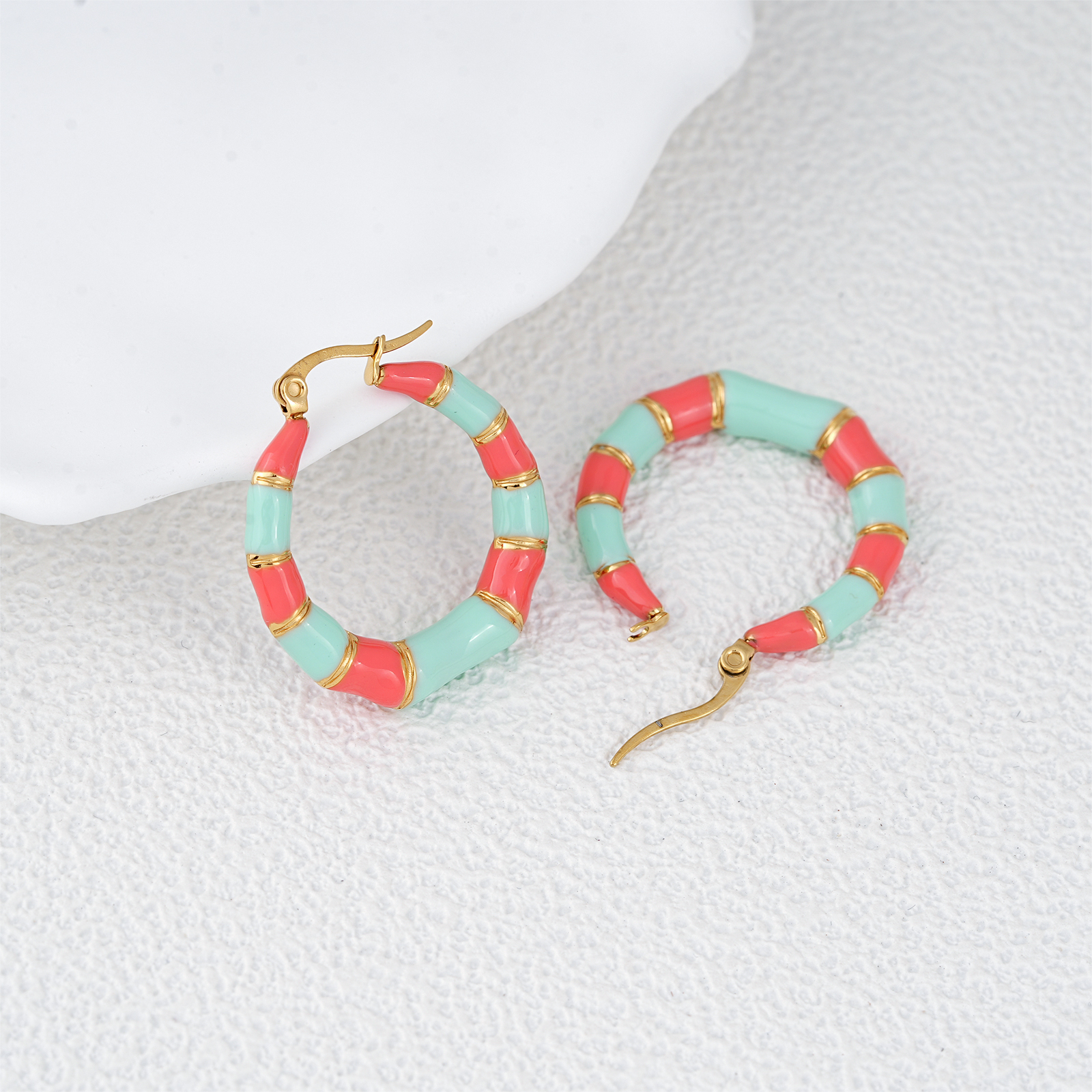 In summary, these gold plated geometric bamboo-inspired hoops unite durable stainless steel construction with radiant enamel artistry. Combining structure, color, and refined gold detailing, they offer the perfect balance between statement design and everyday wearability—an essential addition to any modern jewelry collection.